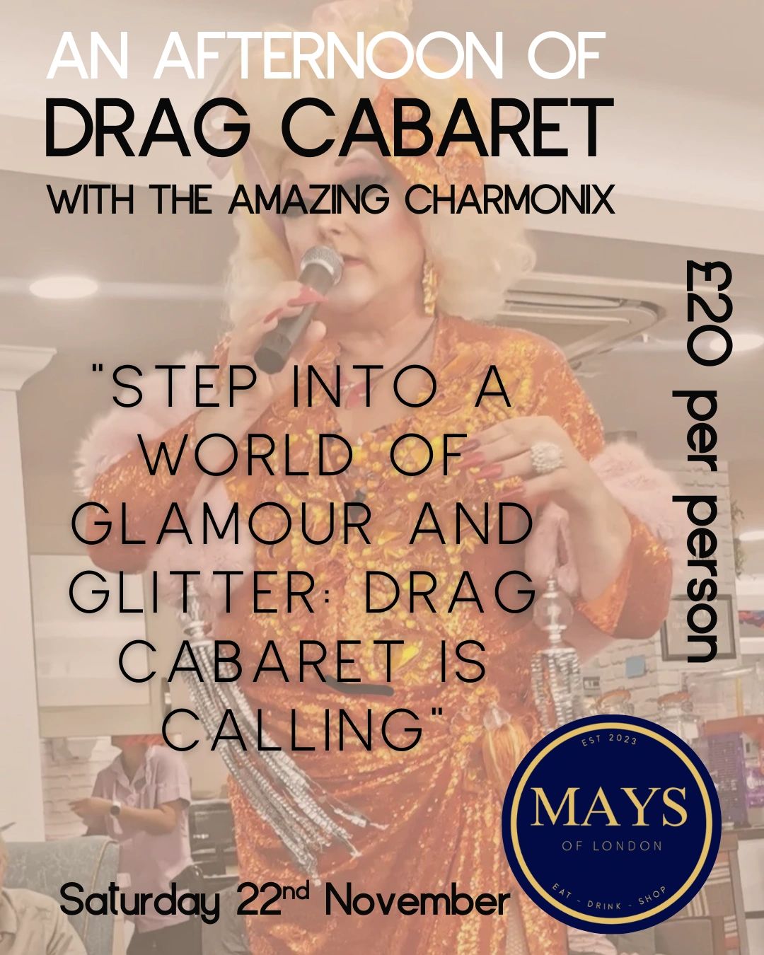 Join us at Mays of London for an unforgettable afternoon of glitz, glamour, and giggles as the fabulous Chamonix takes the stage with her sensational Cabaret Drag Show!
